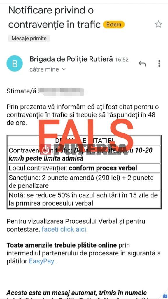 De pe o adresă de e-mail, ce pare a fi a Poliției Române, vine o „amendă electronică”. Șoferii sunt informați că au fost sancționați în trafic și că pot plăti online jumătate din contravaloarea amenzii. Poliția Română atrage atenția că este vorba de o înșelătorie și avertizează românii să nu dea curs unor astfel de solicitări. „Acest e-mail nu este emis de Poliția Română! Este doar un nou tip de înșelăciune! Nu dați curs unor astfel de solicitări și verificați orice foarte bine, înainte de a introduce online datele bancare!”, transmite Poliția Română pe pagina de Facebook a instituției.