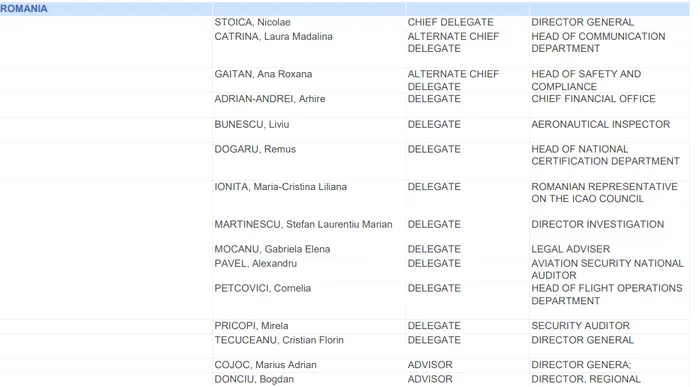 România este reprezentată de oficiali din AACR, AIAS, ROMATSA și alte instituții conexe. Printre aceștia se numără Nicolae Stoica – Director General AACR, responsabil de coordonarea întregii instituții, Laura Mădălina Catrina – Șef Departament Comunicare, Ana Roxana Găitan – Șef Siguranță și Conformitate, Adrian-Andrei Arhire – Chief Financial Officer, Liviu Bunescu – Inspector Aeronautic și Remus Dogaru – Șef Departament Certificare Națională. Cristian-Florin Tecuceanu este director general al AIAS, Ștefan Laurențiu Marian Martinescu este șeful Școlii Superioare de Aviație Civilă, iar Marius Adrian Cojoc, Bogdan Donciu și Valeriu Adrian Florea reprezintă Romatsa.
