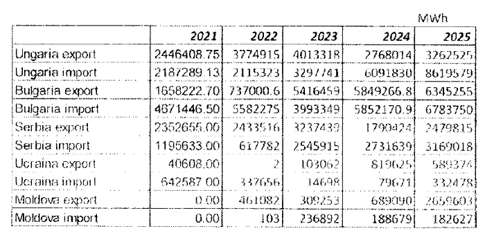 Documentul arată că România continuă să exporte energie către Serbia, Ucraina și Moldova. În schimb, balanța energetică cu Ungaria și Bulgaria arată o dependență tot mai mare de importuri. Importurile au crescut semnificativ în 2024 și 2025, atingând un vârf de peste 8,6 TWh din Ungaria în 2025.