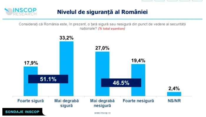 Amintim că un sondaj recent INSCOP în privința studiului ”Barometrul Securității Naționale INSCOP Research – Strategic Thinking Group”, majoritatea românilor (51,1%) crede că România este o țară sigură din punct de vedere al securității naționale.