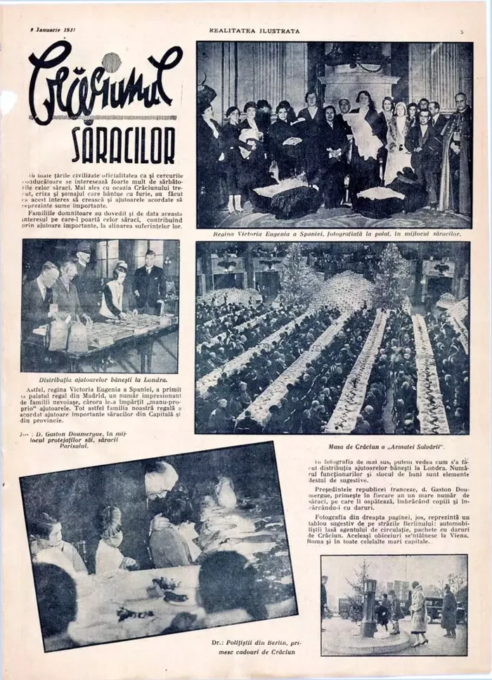 Astfel, regina Victoria Eugenia a Spaniei, a primit la palatul regal din Madrid, un număr impresionat de familii nevoiaşe, cărora le-a împărţit «manu-proprio» ajutoarele. Tot astfel familia noastră regală a acordat ajutoare importante săracilor din Capitală şi din provincie”, relata revista Realitatea Ilustrată în ediția din decembrie 1931.