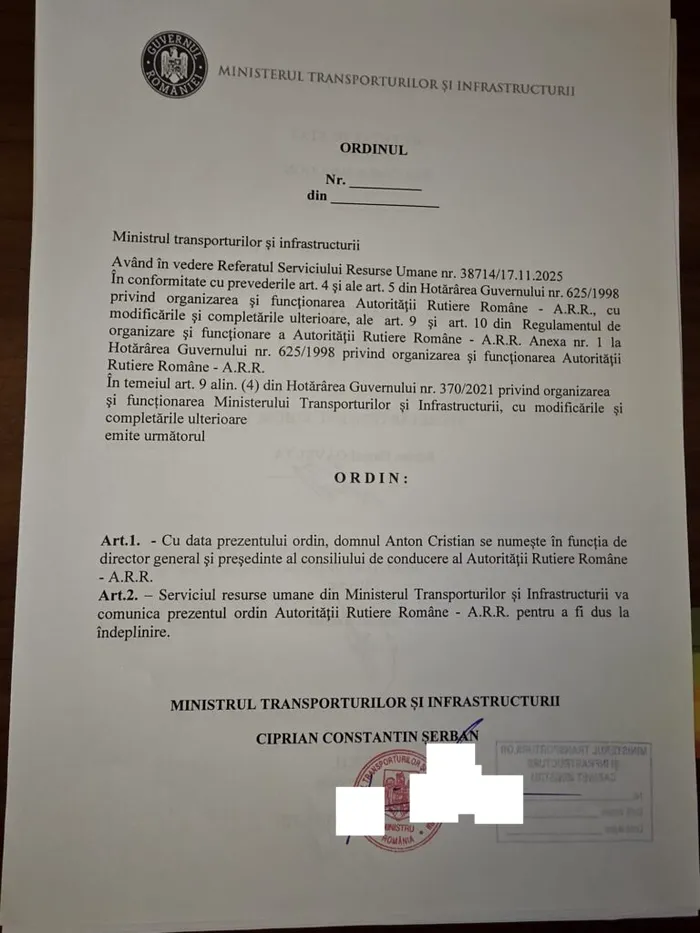 Cristian Anton a fost numit în funcția de director general și președinte al consiliului de conducere al Autorității Rutiere Române-ARR”(vezi documentul).