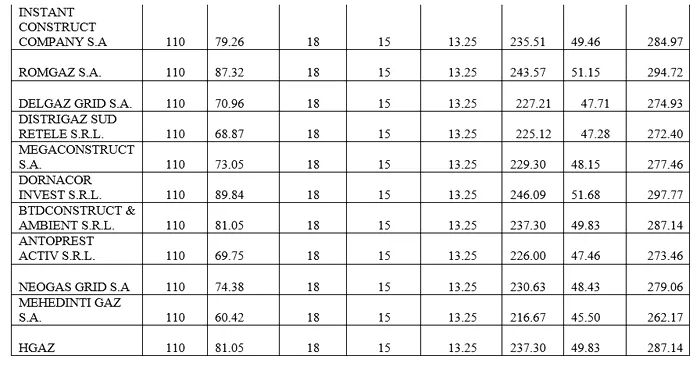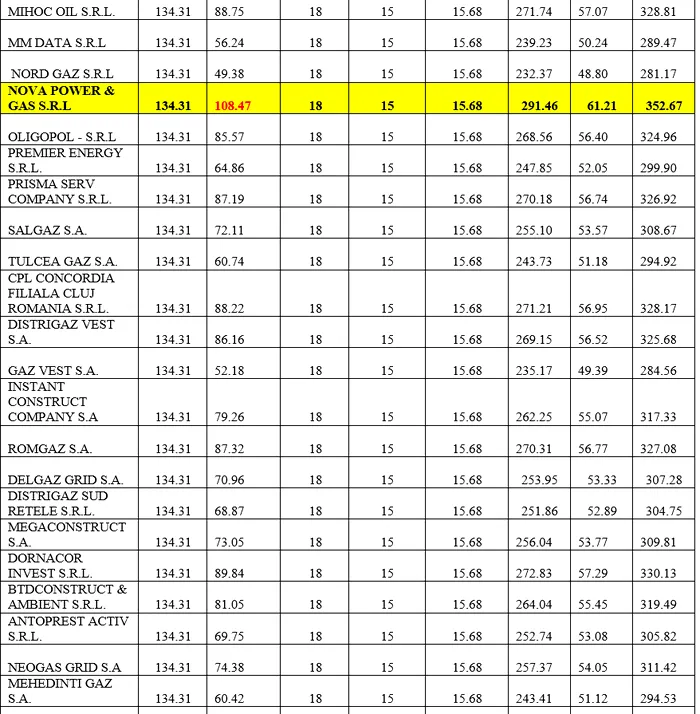 Analiza tabelului de mai jos arată că Nova Power & Gas oferă cel mai competitiv preț de furnizare, dar, din cauza tarifelor ridicate de distribuție, clienții săi ajung să plătească între 303 și 352 lei/MWh (TVA inclus), în funcție de scenariul analizat. În aceeași situație, EURO SEVEN INDUSTRY S.R.L. sau NORD GAZ S.R.L., cu tarife de distribuție mai mici, oferă un preț final semnificativ mai mic.