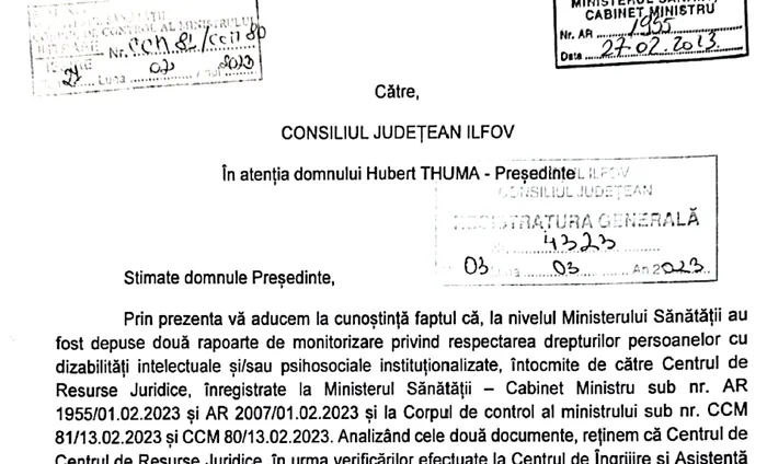 Din documentele primite reiese că Ministerul Sănătății recepționase încă din data de 1 februarie rapoartele Centrului de Resurse Jurdice despre situația din azilele groazei, iar ele a fost trimise la CJ Ilfov abia în data de 3 martie 2023, dată la care au fost înregistrate la CJI, adică după o lună calendaristică, se arată într-un document semnat de Alexandru Rafila.