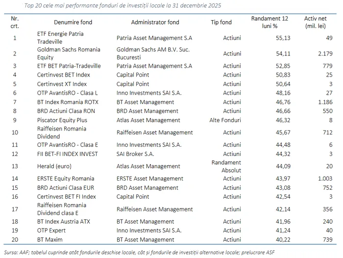 Economiile investite la bursa din România în ultimul an au adus profituri impresionante. Datele oficiale de la finalul anului 2025 arată că piața de capital a oferit randamente excepționale: cele mai performante 20 de fonduri locale au generat câștiguri între 40% și 55%, conform informațiilor prezentate de Autoritatea de Supraveghere Financiară.