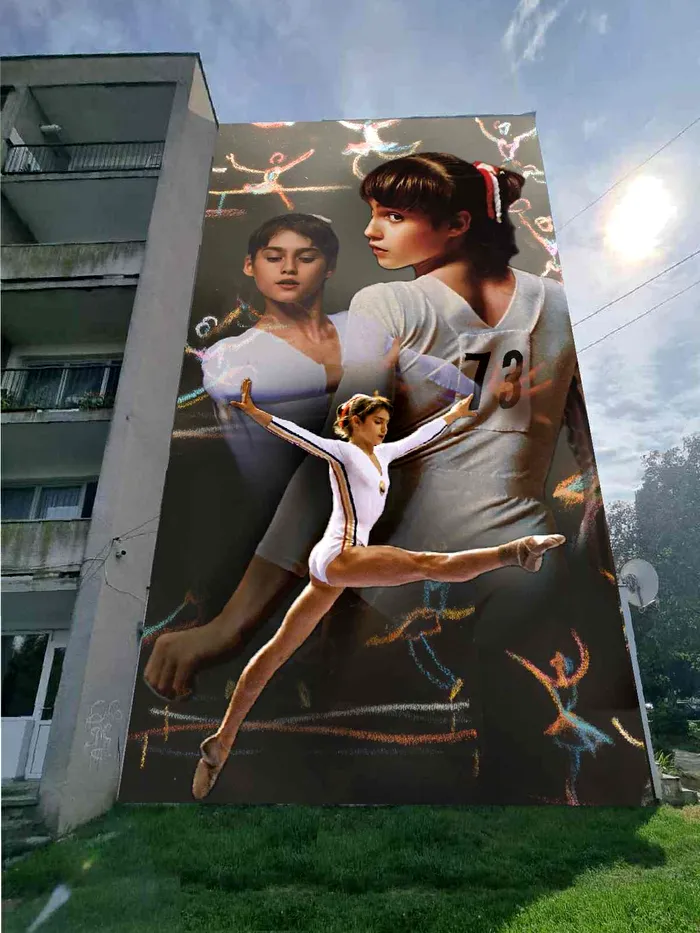 Mural spectaculos dedicat Nadiei Comăneci la Onești