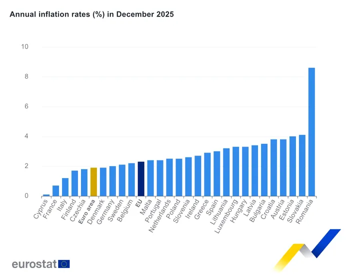 Cele mai scăzute rate anuale au fost raportate în Cipru (0,1%), Franța (0,7%) și Italia (1,2%), iar cele mai ridicate în România (8,6%), Slovacia (4,1%) și Estonia (4,0%). Comparativ cu noiembrie 2025, inflația anuală a scăzut în 18 state membre, a rămas stabilă în trei și a crescut în șase.