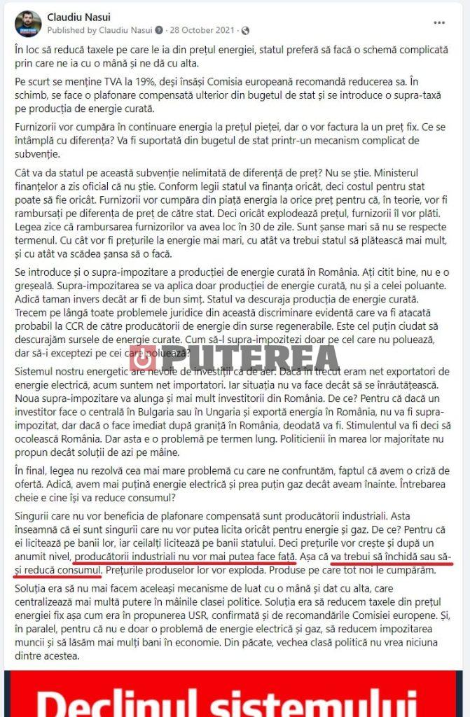 Propunerea USR a fost confirmată și de recomandările Comisiei Europene. Și, în paralel, pentru că nu e doar o problemă de energie electrică și gaz, să reducem impozitarea muncii și să lăsăm mai mulți bani oamenilor și firmelor, ca să-și poată plăti traiul în această veritabilă criză. Din păcate, vechea clasă politică se gândește doar la funcții și la vilele lor personale. Pe ei îi afectează prea puțin creșterile de prețuri ca să le pese să facă altceva decât legi de ochii lumii.”, scrie Claudiu Năsui.