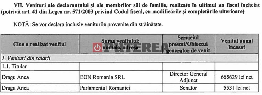 Fosta șefă a Senatului României, Anca Dragu, unul dintre cei mai bogați politicieni români, are în conturi circa 1,4 milioane de lei, plus alți 230.000 de Euro. În anul 2020, Dragu a avut venituri de peste 900.000 lei net, primind 674.850 lei de la EON România, plus alte sume din contracte de închiriere și predarea unor cursuri. În București deține 6 terenuri, 4 apartamente și o casă de locuit. De asemenea, mai are o casă în Costinești, la malul mării. De asemenea, soțul ei a avut venituri de aproximativ 170.000 lei net, în anul 2020.