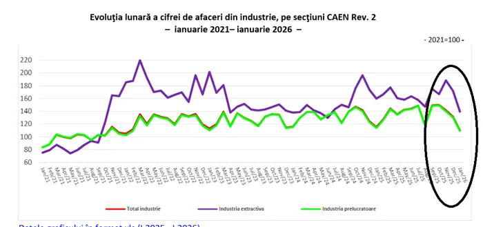 Cifra de afaceri din industrie a scăzut, în termeni nominali, în luna ianuarie 2026 faţă de luna corespunzătoare din anul precedent, pe ansamblu, cu 4,3%, ca urmare a scăderii înregistrate în industria extractivă (-12,8%) și în industria prelucrătoare (-4,0%). Pe marile grupe industriale, scăderi au înregistrat: industria energetică (-10,6%), industria bunurilor intermediare (-7,7%), industria bunurilor de uz curent (-4,7%) și industria bunurilor de folosință îndelungată (-3,4%). Industria bunurilor de capital a crescut cu 0,8%.