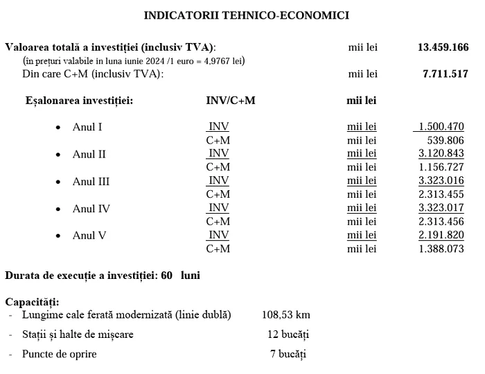 Indicatorii tehnico-economici au fost avizați de Ministerul Transporturilor și Infrastructurii și de Consiliul Interministerial de Avizare a Lucrărilor Publice de Interes Național, după finalizarea studiului de fezabilitate realizat de CFR SA.