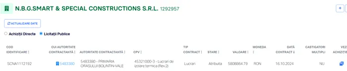 În ciuda statutului de firmă-cheie a familiei, datele publice arată că NBG Smart & Special Constructions SRL a obținut contracte finanțate din bani publici în valoare de aproximativ 6 milioane de lei, cel mai mare fiind cu primăria Bolintin-Vale, pentru lucrări de izolare termică.