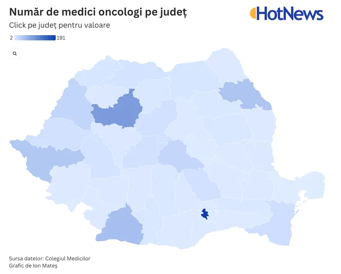 Județele cu cei mai puțini medici, care tratează pacienții cu cancer, sunt: