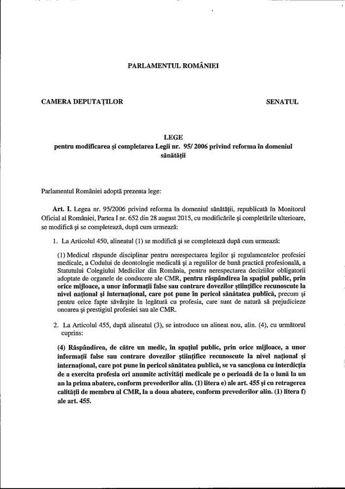 Însă, senatorii, dar mai ales cei trei inițiatori PSD și USR, au ignorat faptul că, potrivit Legii nr.95/2006- privind reforma în sănătate, retragerea calității de membru al Colegiului Medicilor din România se decide printr-o hotărâre definitivă a unei instanțe de judecată și nicidecum de către Colegiul Medicilor din România. Proiectul a trecut de Senat, dar rămâne de văzut dacă va fi adoptat și de Camera Deputaților, care este for decizional. Oare nu se urmărește instaurarea unei noi dictaturi medicale?