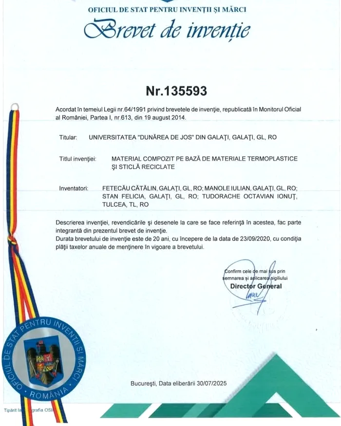 „Oficiul de Stat pentru Invenții și Mărci a acordat Brevetul de Invenție nr 135593 unei echipe de cercetători de la Universitatea „Dunărea de Jos” din Galați și Tulcea pentru o descoperire deosebită: un procedeu de realizare a unui material compozit din plastic și sticlă reciclate”, se spune într-un comunicat al OSIM.