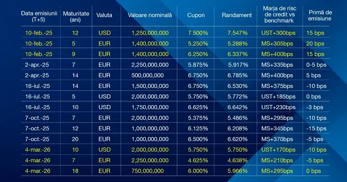 În cazul obligațiunilor în euro, randamentul pentru o maturitate de șapte ani a scăzut la 4,64%, față de 5,29% pentru o perioadă de cinci ani în 2025. De asemenea, și în cazul obligațiunilor denominate în dolari costurile au fost mai reduse, coborând de la 7,55% pentru 12 ani în 2025 la 5,75% pentru 10 ani în emisiunea realizată în acest an.