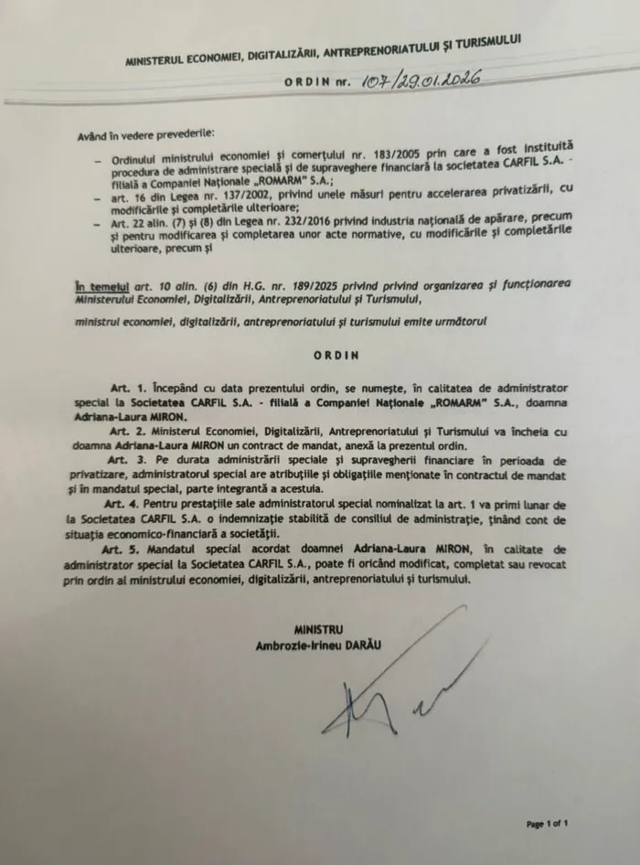 Prin Ordinul nr. 107 din 29 ianuarie 2026, ministrul USR al Economiei, Ambrozie-Irineu Darău, o numește pe șefa sa de cabinet, Adriana Miron, ca administrator special la producătorul de tehnică militară „Carfil” S.A.Brașov, subunitate strategică a ROMARM (vezi documentul).