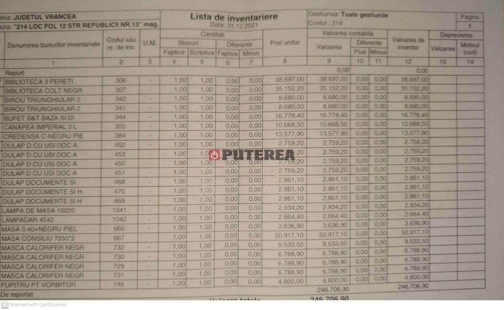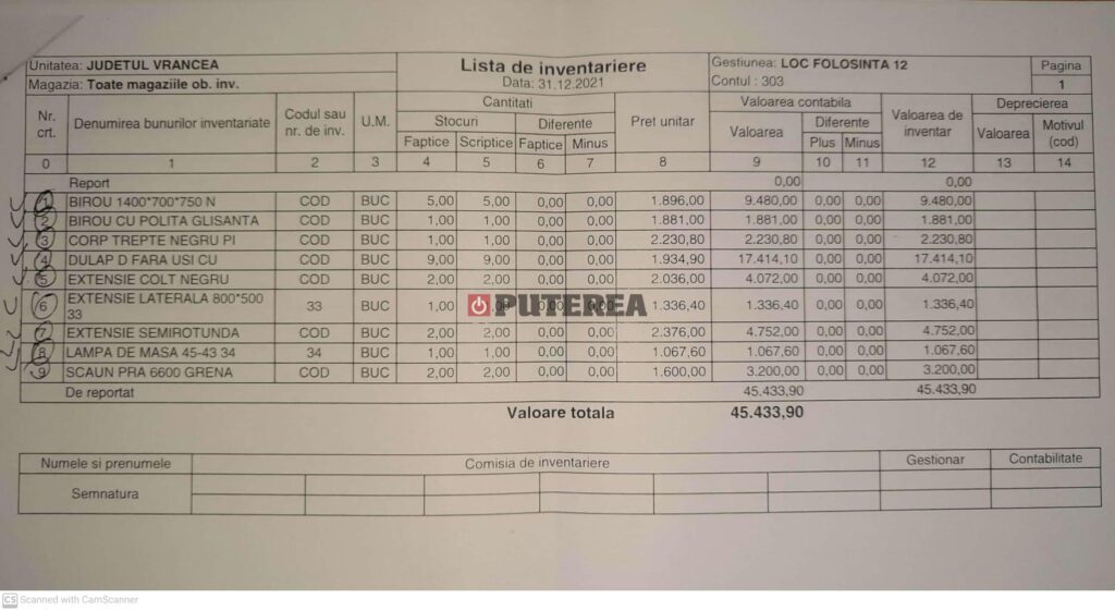 Cu ocazia preluării fostului sediu al filialei județene PSD din Focșani, Consiliul Județean Vrancea a făcut inventarul bunurilor achiziționate din fonduri publice și folosite de liderii PSD Vrancea în folosul activității lor politice.