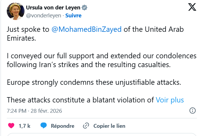 La rândul său, Ursula von der Leyen condamnă „atacurile injustificabile” ale Iranului împotriva Emiratelor Arabe Unite