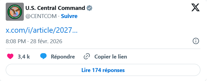 Comandamentul militar american pentru Orientul Mijlociu, Centcom, anunță că, în urma loviturilor asupra Iranului, forțele americane s-au „apărat cu succes împotriva a sute de atacuri cu rachete și drone iraniene” și că „nu a fost raportată nicio victimă sau rănit în rândul americanilor legat de confruntări”.