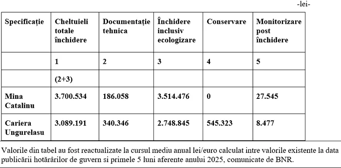 Aceste perimetre au fost aprobate la închidere definitiva și monitorizare a factorilor de mediu postînchidere prin Hotărârile de Guvern nr. 1008 din 2 august 2006 pentru perimetrul Catalinu, respectiv 644 din 20 iunie 2007 pentru perimetrul Ungurelasu.