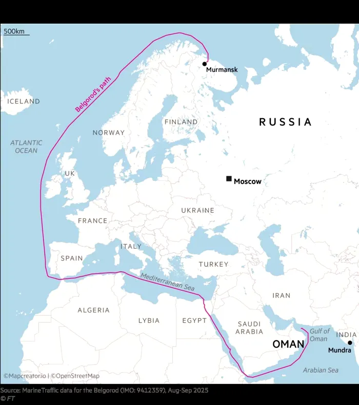 Transportul petrolului achiziționat de Mittal Energy a implicat o rețea complexă de nave sancționate, între care Belgorod, Danshui, Dignity și Primorye, toate incluse pe lista neagră a Statelor Unite. Petrolul a fost încărcat inițial în portul arctic Murmansk, un punct-cheie pentru exporturile rusești de țiței, și a parcurs mii de kilometri până în Golful Oman. Acolo a avut loc un transfer pe petrolierul Samadha, navă care nu figurează pe listele americane de sancțiuni, dar care fusese sancționată de Uniunea Europeană.