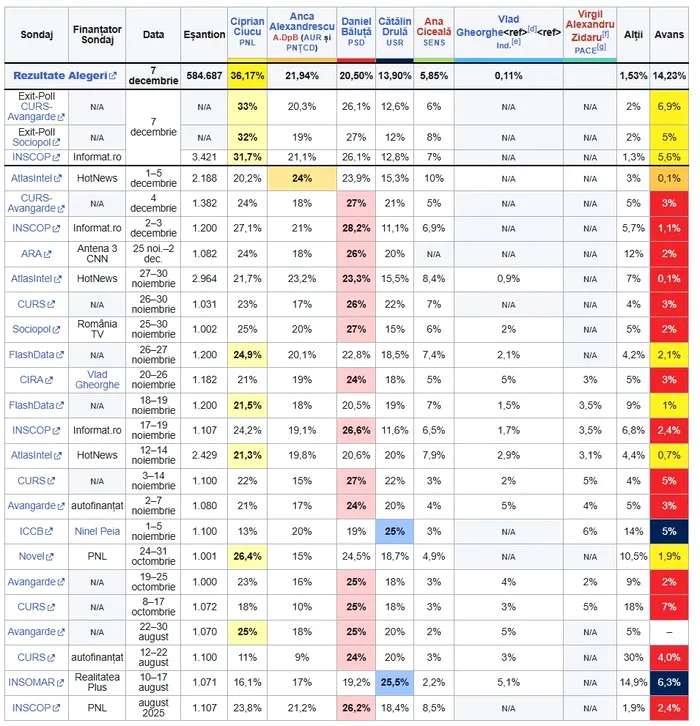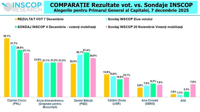 Rezultatele finale ale scrutinului pentru Primăria Generală a Municipiului București (7 decembrie 2025) au generat un cutremur în industria sondajelor de opinie din România. Deși majoritatea măsurătorilor din perioada campaniei electorale (noiembrie – decembrie) indicau o cursă extrem de strânsă, cu un ușor avantaj pentru tabăra social-democrată, urnele au oferit o realitate categoric diferită: o victorie zdrobitoare a lui Ciprian Ciucu (PNL).