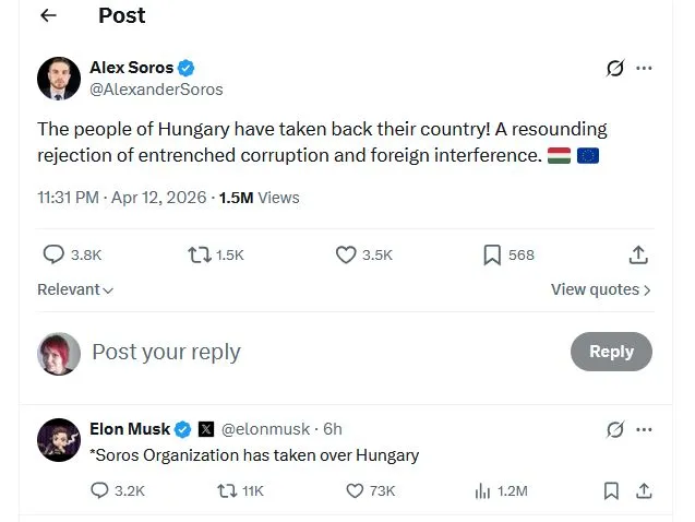 Victoria partidului Tisza la alegerile parlamentare din Ungaria a declanșat un schimb de replici tăioase între Alex Soros, fiul miliardarului George Soros și Elon Musk . Viktor Orban a pierdut puterea după 16 ani, iar Musk acuză că organizația Soros a preluat acum controlul asupra țării.