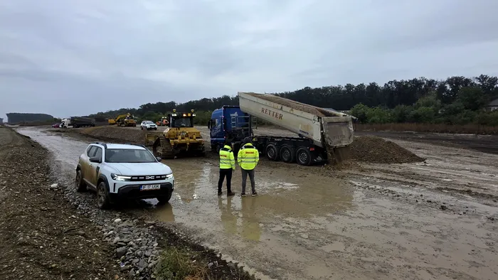 Constructorul nu a luat pauză, în ciuda ploii, și executa lucrări pentru care vremea nu este un impediment. Camioanele mișunau în șantier, pentru că se face aprovizionarea cu material în depozit. Excavatoarele și buldozerele erau și ele la datorie. „Ne-am asumat un termen și nu poți să pierzi timpul, indiferent de vremea de afară“, spun reprezentanții companiei.