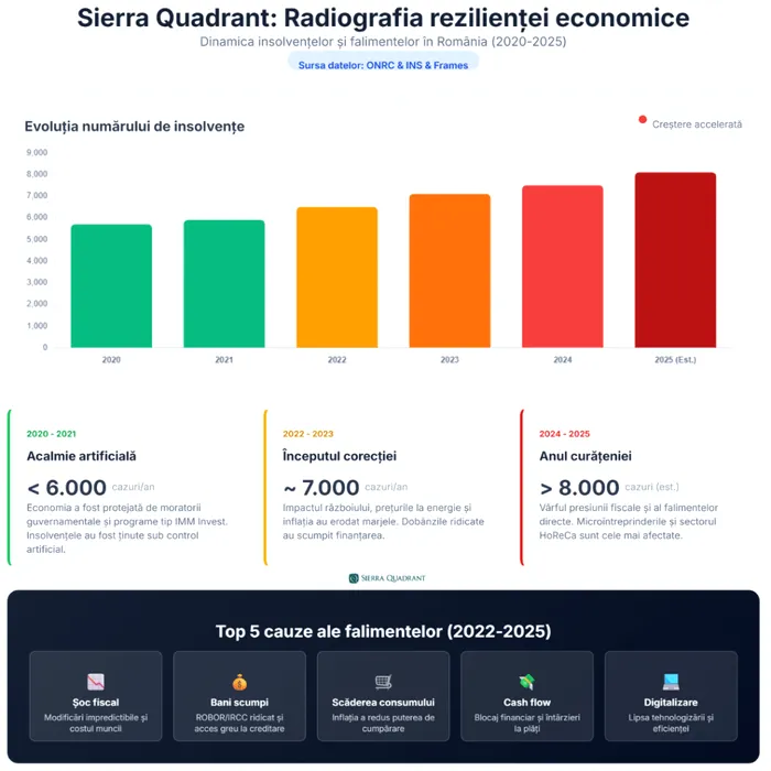 Economia României traversează una dintre cele mai ample transformări din ultimul deceniu. După ani alimentați de ajutoare de stat, credite ieftine și măsuri care au suspendat temporar problemele reale, piața intră într-o fază de „curățenie economică”, marcată de un val accelerat de insolvențe și falimente. Datele analizate de Sierra Quadrant arată că 2025 a fost anul în care vulnerabilitățile ascunse sub covor au ieșit la suprafață.