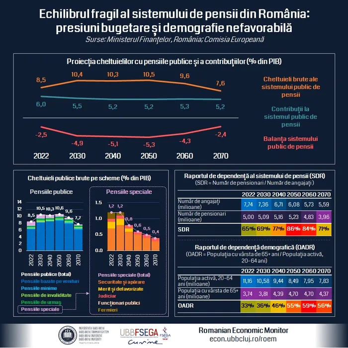 România se află într-o zonă de risc privind sustenabilitatea sistemului public de pensii, pe fondul îmbătrânirii rapide a populației, emigrării masive a forței de muncă, muncii informale și presiunilor bugetare crescânde. Specialiștii Romanian Economic Monitor (RoEM) din cadrul Facultății de Științe Economice și Gestiunea Afacerilor (FSEGA) a Universității Babeș-Bolyai (UBB) din Cluj-Napoca susțin că doar printr-o combinație de disciplină fiscală și stimulare a economisirii private sistemul de pensii poate rămâne viabil și poate garanta o bătrânețe demnă pentru generațiile viitoare.