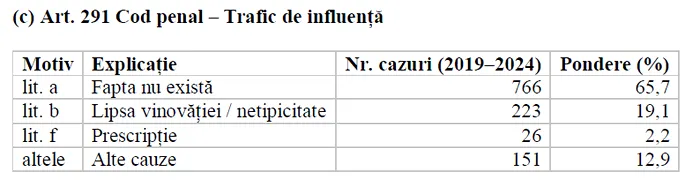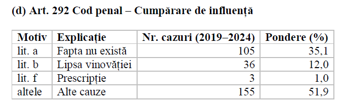 Interpretare: această structură reflectă dificultatea cronologică a urmăririi penale: multe dosare se deschid pe baza denunțurilor vechi, ajungând rapid la prescripție. De asemenea, probele indirecte de influență (promisiuni, avantaje, relații de intermediere) sunt rar documentate eficient, ceea ce duce la rată ridicată de clasare.