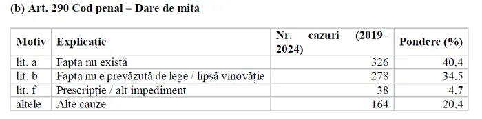 3. La darea de mită și cumpărarea de influență, rata mai redusă a clasărilor (46%) nu indică performanță, ci o selectivitate a urmăririi, fiind cauze cu autodenunț și cooperare a făptuitorului, unde probele sunt furnizate de suspecți.