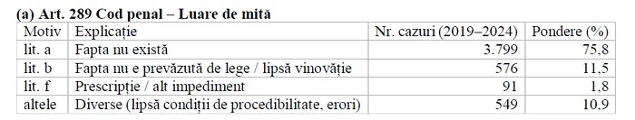 Interpretare: în peste jumătate din cazuri, motivele de clasare nu se bazează pe probe de nevinovăție, ci pe cauze procedurale (retragerea denunțului, lipsa plângerii, erori de competență). Aceasta arată un nivel redus de specializare în instrumentarea cauzelor privind corupția pasivă.