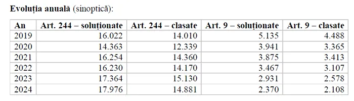 – numărul de dosare înregistrate, soluționate și clasate în perioada 2019–2024 pentru infracțiunile prevăzute la art. 289–292 CP, art. 244 CP și art. 9 din Legea nr. 241/2005;