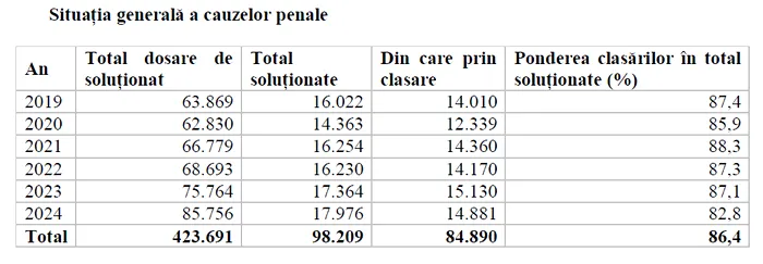 Analiza statistică a activității Ministerului Public în perioada 2019–2024 relevă un volum constant de cauze penale, dar cu un nivel de eficiență în scădere. Datele centralizate arată că, în această perioadă, procurorii au avut de soluționat, în medie, peste 13.000 de dosare anual în materia infracțiunilor de corupție și economice, dar rata de clasare a crescut progresiv, depășind 85% în ultimii ani.
