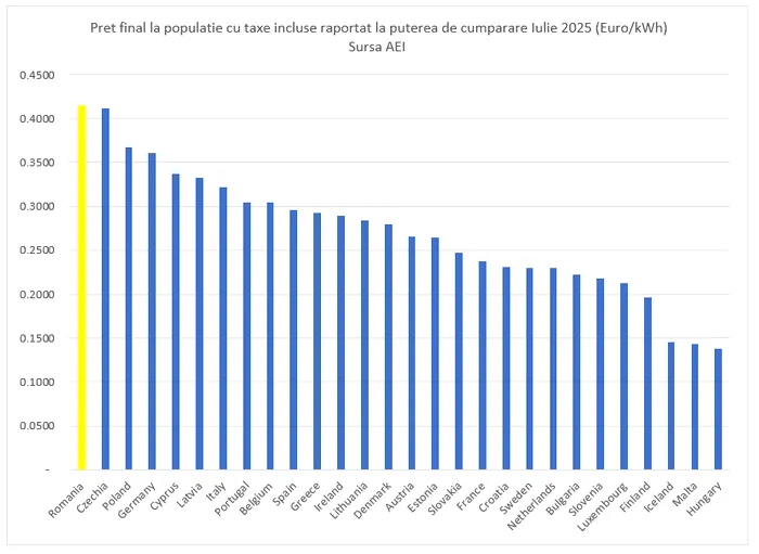 Potrivit datelor din iulie 2025, creșterea prețului energiei electrice pentru consumatorii casnici din România între lunile iunie și iulie 2025 a fost de aproximativ 60%, mai mult decât dublă față de următoarea cea mai mare creștere înregistrată în Europa. În clasamentul prețurilor absolute, România se află pe locul 10, dar ajustarea la puterea de cumpărare relevă un impact mult mai sever asupra bugetelor românilor. Comparativ, prețul energiei în Ungaria, cea mai avantajoasă țară din regiune, este de patru ori mai mic raportat la venitul populației, se arată într-o analiză făcută de Asociația Energia Inteligentă.
