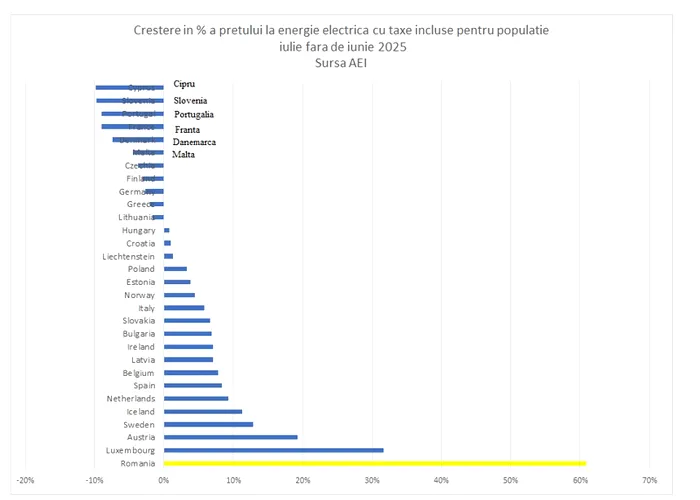Graficele recente publicate de AEI arată clar disparitățile dintre România și celelalte state europene. Creșterea procentuală a prețului energiei electrice în România a fost aproape dublă față de următoarea țară, Luxemburg sau Austria, care au înregistrat majorări de 30%, respectiv 20%. Majoritatea țărilor europene s-au situat între 0% și 15%, iar câteva state au raportat chiar scăderi ale prețurilor (Cipru, Slovenia, Portugalia, Franța și Danemarca).