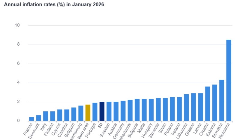 România rămâne țara cu cea mai mare rată a inflației din Uniunea Europeană, înregistrând o creștere anuală a prețurilor de 8,5% în ianuarie 2026. Între timp, media inflației în UE a scăzut la 2%, potrivit datelor publicate miercuri de Eurostat.