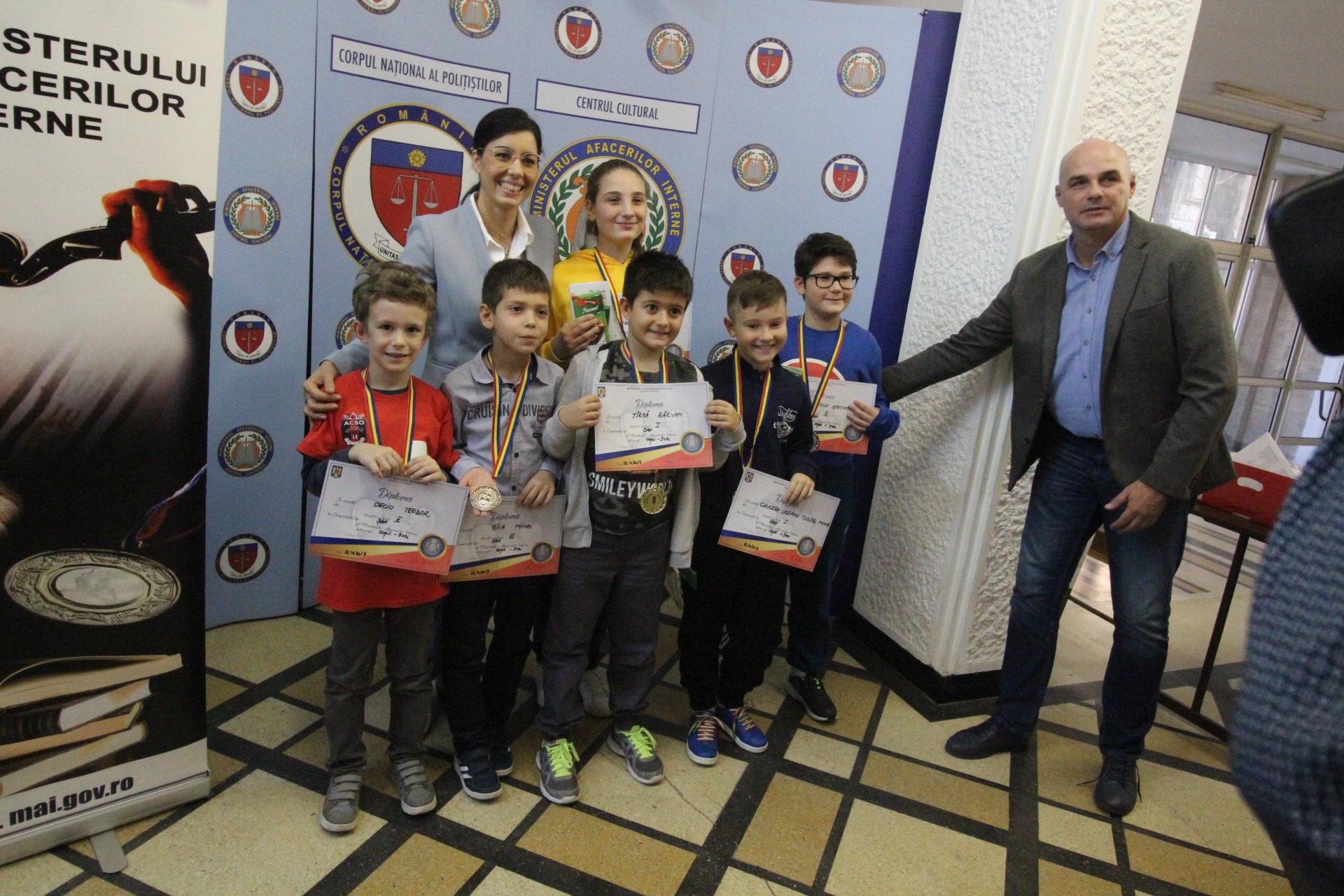 Șahul polițiștilor. Imagine de arhivă din 2019: Loredana Dinu, fostă campioană olimpică la scrimă, îi premiază pe câștigătorii competiției de copii organizate la Centrul Cultural al MAI, București. Scrima premiază șahul.