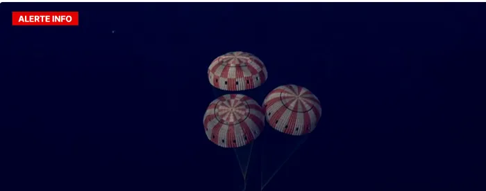 În faza finală, cele trei parașute principale, fiecare cu un diametru de aproximativ 35 de metri, au redus viteza capsulei de la câteva sute de km/h la aproximativ 30–35 km/h înainte de impactul cu oceanul.