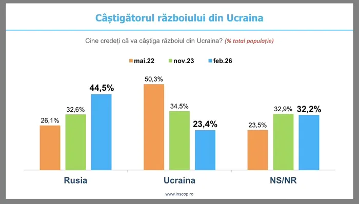 44.5% dintre cei chestionați consideră că Rusia va câștiga războiul din Ucraina (față de 26.1% în mai 2022 și 32.6% în noiembrie 2023), în timp ce 23.4% indică Ucraina (față de 50.3% în mai 2022 și 34.5% în noiembrie 2023). 32.2% nu știu sau nu răspund (față de 23.5% în mai 2022 și 32.9% în noiembrie 2023).