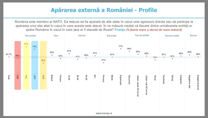 Votanții PNL și USR, tinerii sub 30 de ani și persoanele de peste 60 de ani, cei cu educație superioară, locuitorii din București și din urbanul mare și angajații din sectorul public sunt cei mai încrezători că Franța ar apăra țara dacă ar fi atacată de Rusia. Votanții USR, persoanele între 30 și 44 de ani, cei cu educație primară și locuitorii din mediul rural cred cel mai puțin că Franța ar interveni în cazul unui atac rusesc asupra României.
