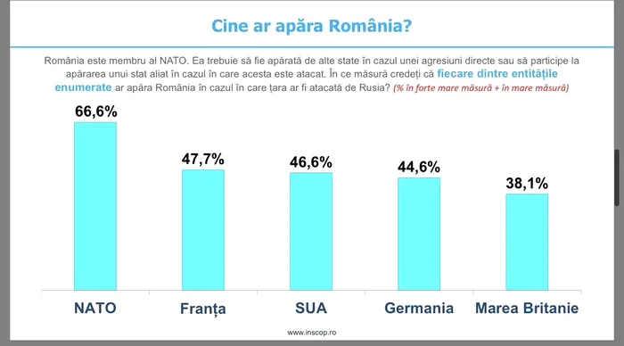 Întrebați în ce măsură cred că diversele entități/ țări ar apăra România în cazul unui atac al Rusiei, 66.6% dintre respondenți au indicat în foarte mare sau în destul de mare măsură NATO, 47.7% – Franța, 46.6% – SUA și 44.6% – Germania, Marea Britanie – 38.1%.