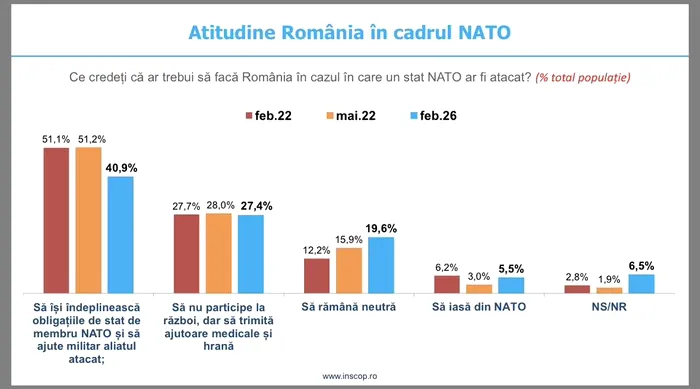 În cazul în care un stat NATO ar fi atacat, 40.9% dintre cei intervievați consideră că România ar trebui să își îndeplinească obligațiile de stat NATO și să ajute militar aliatul atacat (față de 51.1% în februarie 2022 și 51.2% în mai 2022). 27.4% cred că România nu ar trebui să participe la război, dar să trimită ajutoare medicale și hrană (față de 27.7% în februarie 2022 și 28% în mai 2022). 19.6% ar alege ca România să rămână neutră (față de 12.2% în februarie 2022 și 15.9% în mai 2022), în timp ce 5.5% și-ar dori ca țara să iasă din NATO (față de 6.2% în februarie 2022 și 3% în mai 2022). 6.5% nu știu sau nu răspund (față de 2.8% în februarie 2022 și 1.9% în mai 2022).