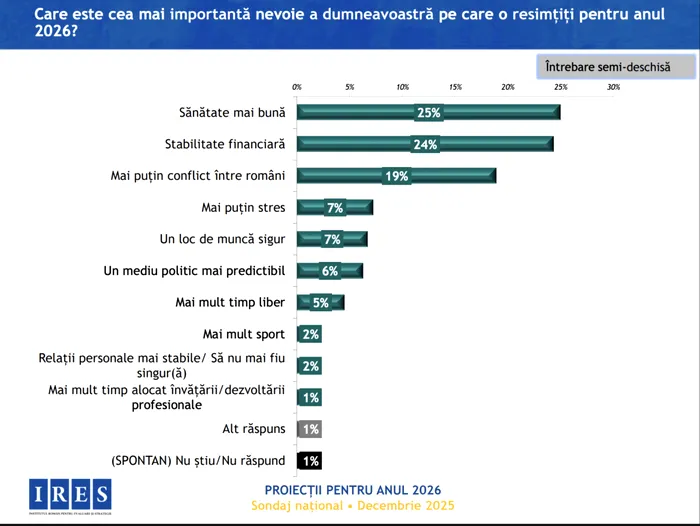 Sănătatea personală și a familiei se află printre principalele teme de preocupare pentru 2026. Respondenții indică nevoia de siguranță și stabilitate ca priorități esențiale.