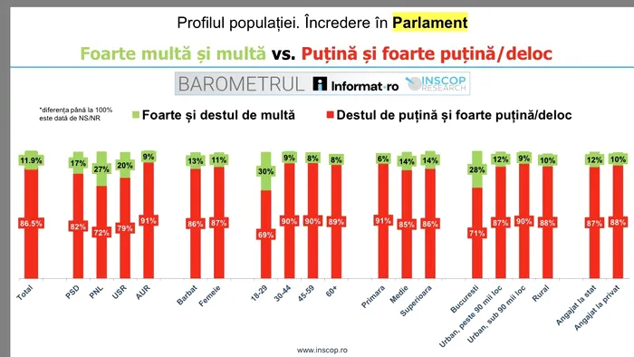 Parlamentul României se află pe ultimul loc în clasament, cu o cotă de încredere de doar 11,9%, în scădere față de anul precedent. Această cifră indică o deconectare masivă a legislativului de agenda reală a cetățeanului. Președinția înregistrează, de asemenea, o scădere semnificativă, ajungând la 27,9% încredere multă și foarte multă, comparativ cu aproape 35% în urmă cu șase luni.