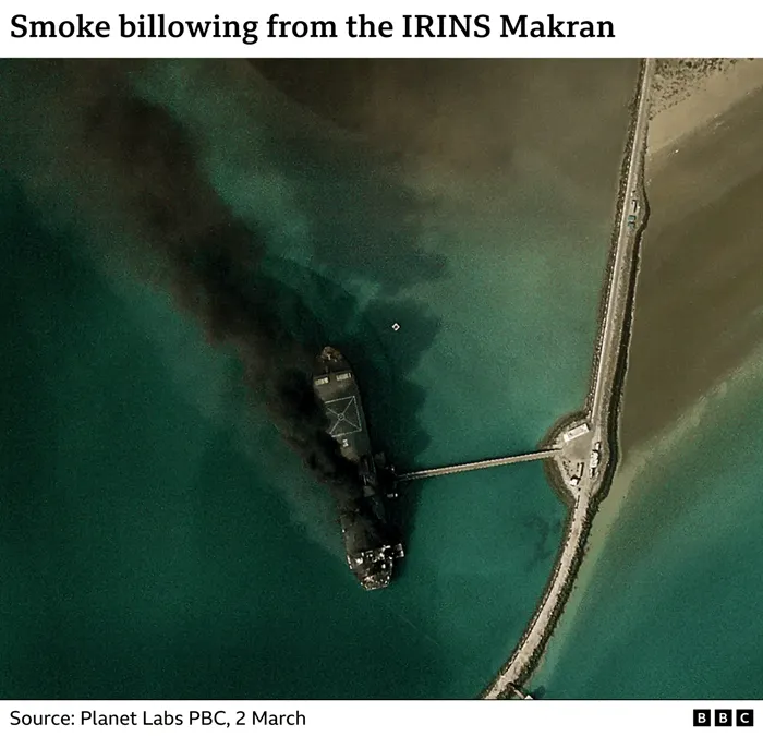 Imaginile satelitare surprind fumul dens ridicându-se de la navele aflate în porturile Konarak și Bandar Abbas, acesta din urmă fiind un nod strategic la strâmtoarea Hormuz și sediul principal al marinei iraniene. Una dintre cele mai afectate nave este IRINS Makran, cea mai mare navă a Iranului, utilizată anterior ca port-dronă. Fotografiile arată fumul negru ridicându-se de pe Makran, care se afla în doc la Bandar Abbas.
