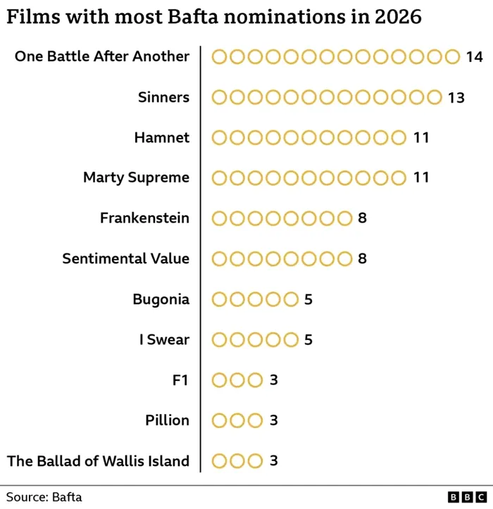 Printre favoritele serii se numără „One Battle After Another”, thriller politic cu accente comice regizat de Paul Thomas Anderson și cu Leonardo DiCaprio în rol principal, și „Sinners”, film de groază cu vampiri semnat de Ryan Coogler. Alte producții notabile includ drama shakespeariană „Hamnet” și biografia sportivă „Marty Supreme”.