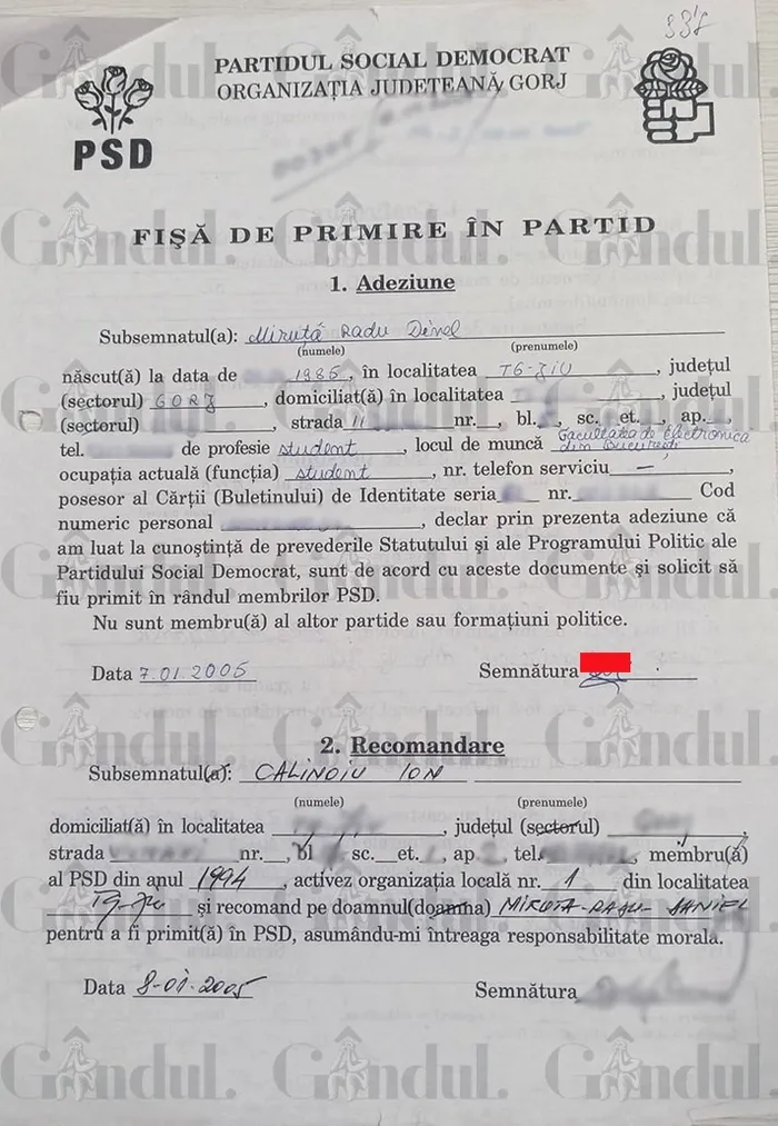Documentul intrat în posesia Gândul arată că, pe 7 ianuarie 2005, imediat după sărbătorile de iarnă, Radu-Dinel Miruță s-a prezentat personal la sediul organizației județene a PSD Gorj. La acea vreme, acesta era student la Facultatea de Electronică din București și a solicitat oficial primirea în rândurile partidului. Pe fișă apare mențiunea că intrarea tânărului Miruță în politică se făcea la recomandarea lui Ion Călinoiu, președintele Consiliului Județean Gorj din acea perioadă.